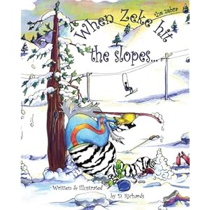 The season is winter and Zeke the zebra wants to go skiing. He borrowed skis and headed west to his family's ski shack.