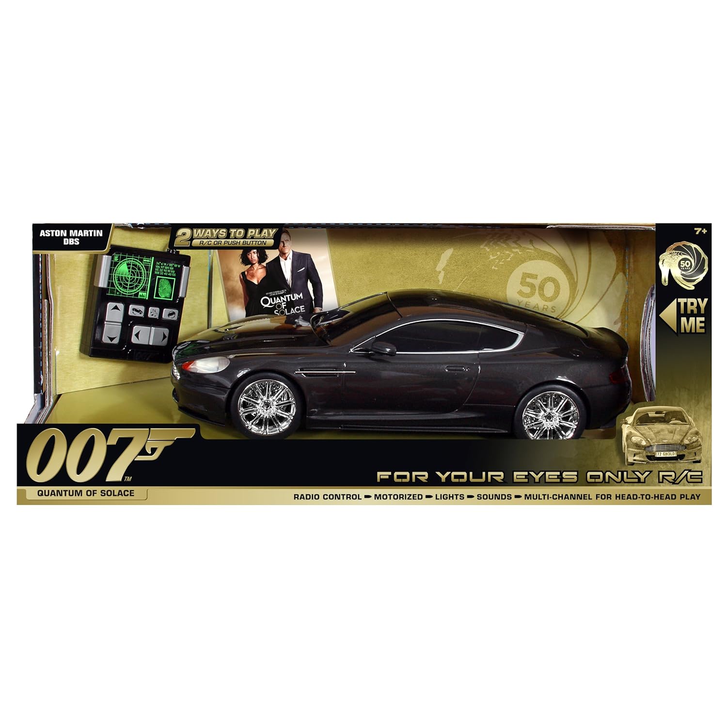 James Bond, code name "007", British Secret Service. Licensed to kill. 2012 marks the 50th anniversary of the release of the first James Bond movie, "Dr. No". It also marks the release of the 23rd movie in the franchise, "Skyfall". The 50 years of James Bond have brought to life some of the most recognizable cars in the world. Cars that exemplify the pinnacle of automotive luxury and the zenith of secret agent stealth and technology. To commemorate this anniversary Toy State, the industry leading maker of action packed lights and sounds cars, is introducing a line of the iconic James Bond 007 automobiles. Cars that faithfully recreate those seen in the movies. These cars feature special lights, hidden, pop-up weapons, dramatic motorized actions and, of course, the iconic James Bond theme music. The For Your Eyes Only R/C gives you the car chase of a life time. A smart phone inspired "touch screen" controller guides the full-function radio control driving of the Aston Martin DBS from Quantum of Solace. Just like the car in the movie the DBS performs high speed, death-defying front and side wheelies, all controlled by you and the "smart phone" controller. The DBS has working head lights and tail lights and the iconic Bond theme music. And there are 2 ways to play, for double the fun. Push the buttons on the car for traditional lights and sound play or use the controller for high speed R/C action. The cars in the For Your Eyes Only range have multiple channels for head-to-head play.