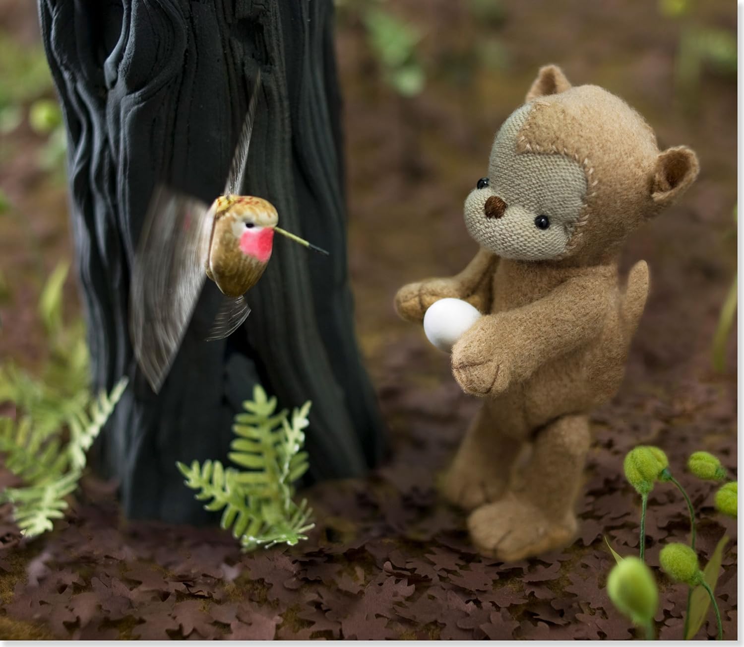 Artist Rebecca Dudley crafts each tiny leaf, flower, and creature that appears in Hank's forest in breathtaking detail, bringing the sunlit woods to life. From delicate ferns to the glow of Hank's little campfire, Hank Finds an Egg immerses you in its vivid miniature world.